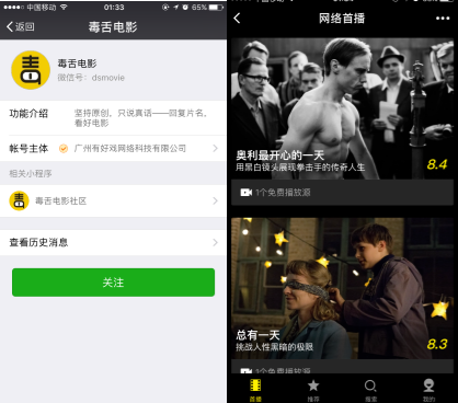 左为公众号介绍页;右为公众号主体开发的小程序